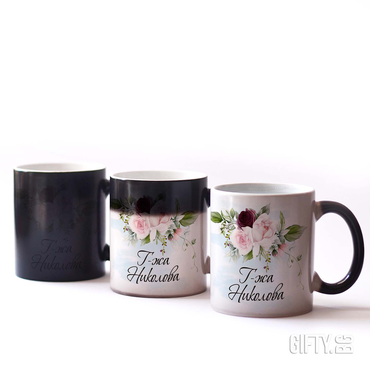 Чаша със стилни цветя за учителка с нейното име и пожелание.
