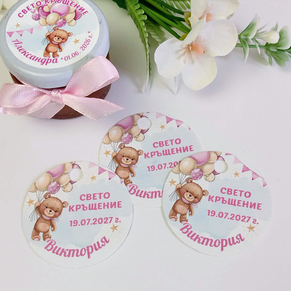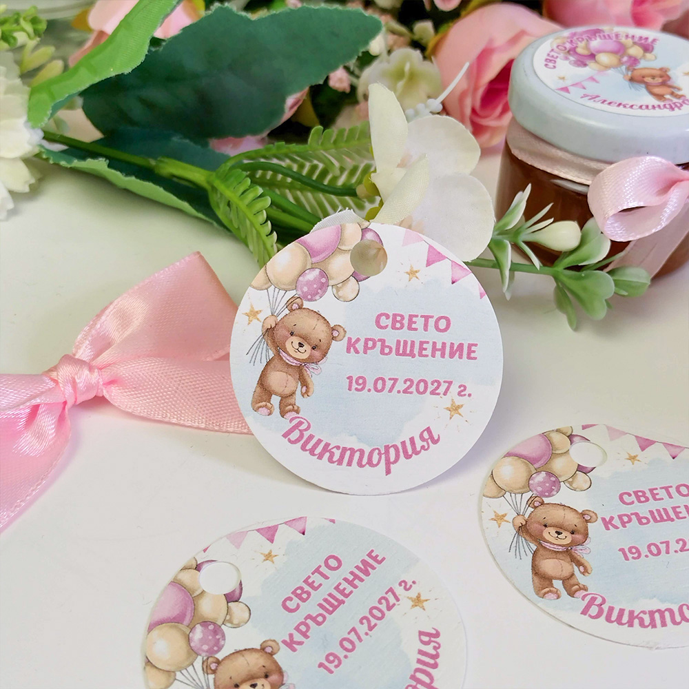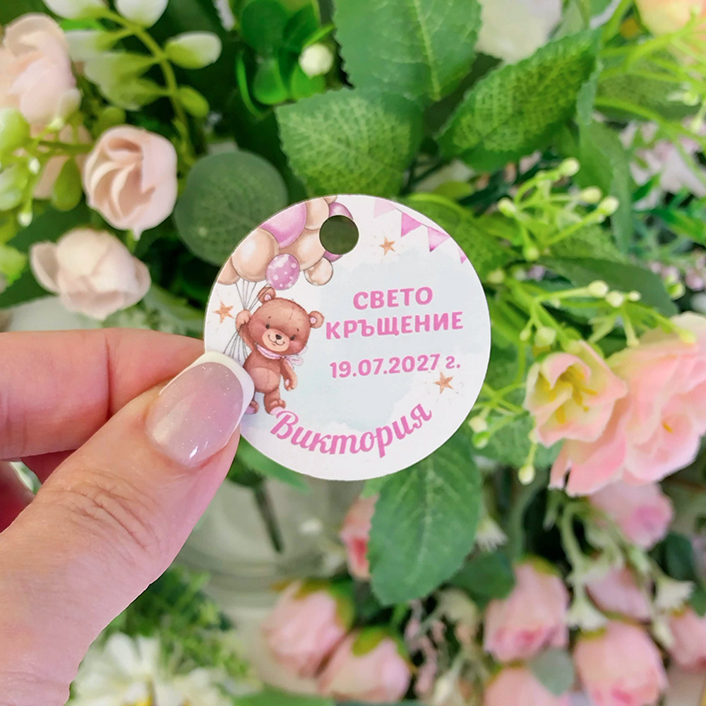 Кръгли картонение етикети (тагчета) за кръщене с мече