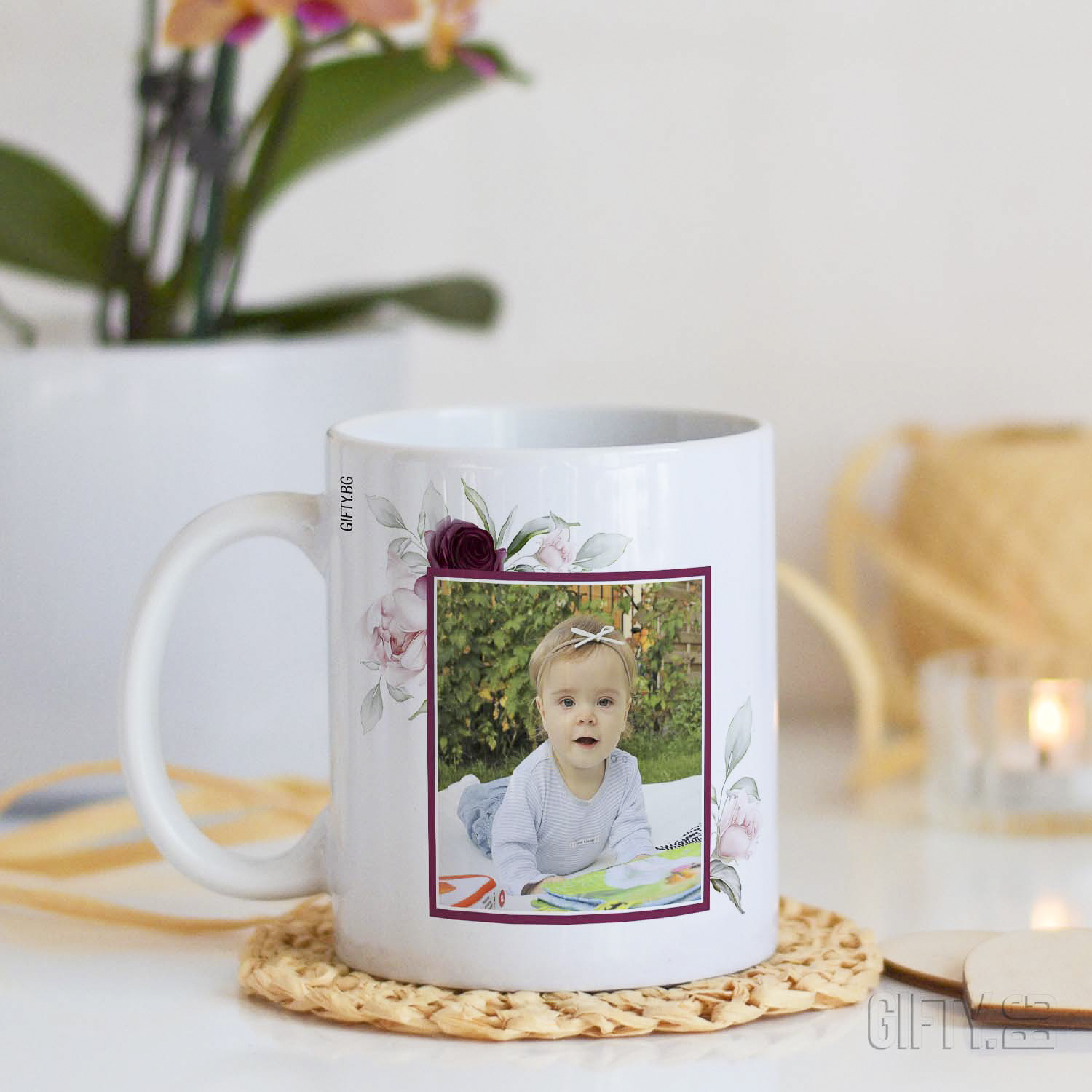 Десенът е букет от красиви рози, като на едната страна на чашата е изписано: "Честит празник, мила бабо!", от другата страна може да бъде отпечатана Ваша снимка или същия надпис. Можете да поднесете тази красива чаша, като подарък на Вашата любима баба за нейния рожден ден, имен ден или за празника на жената  - 8 март. Перфектен подарък, с който ще я изненадате приятно.
