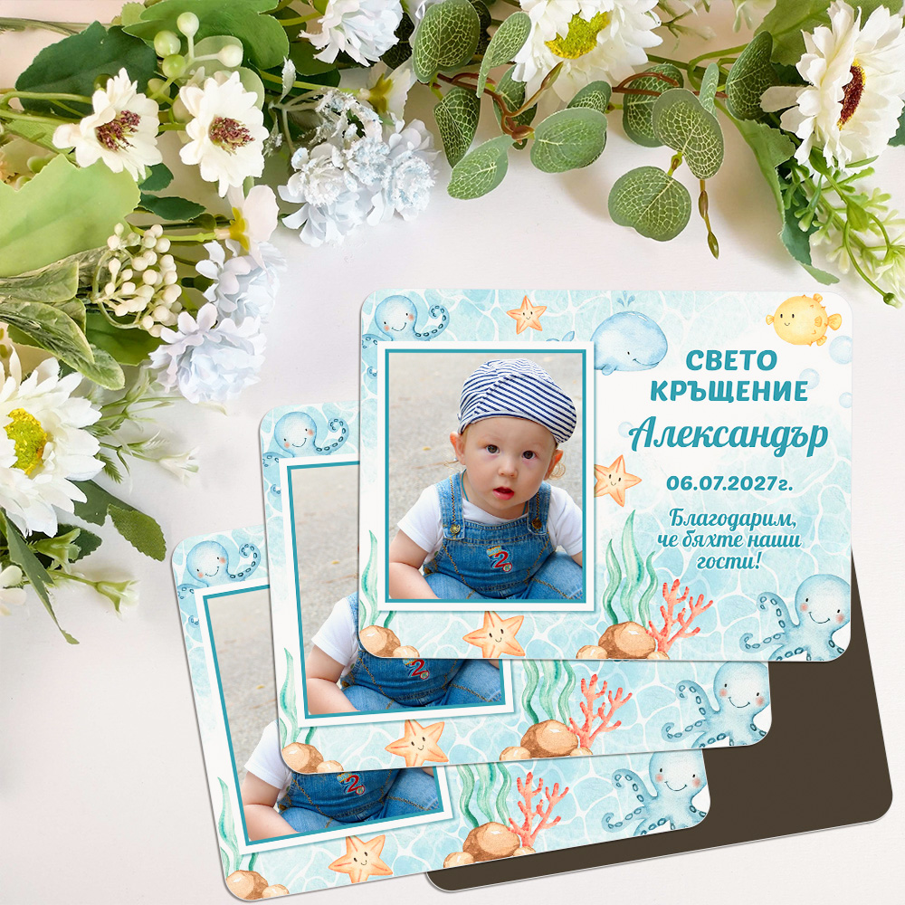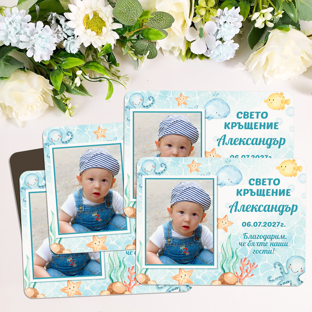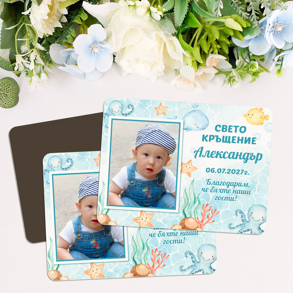 Надписът върху магнита може да бъде променен по ваш избор според повода (кръщене, погача, рожден ден), името на детето и датата на Вашето събитие.