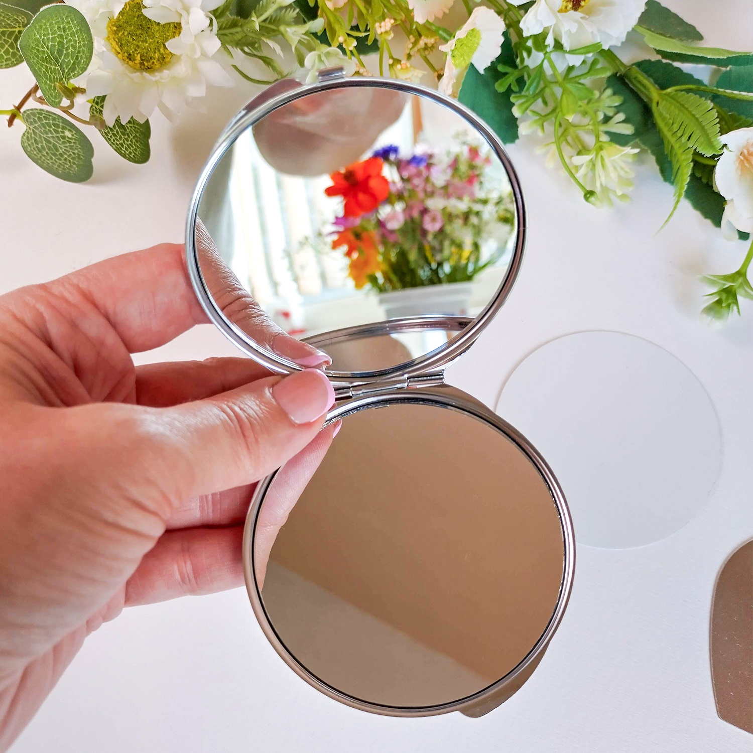 Персонализирано компактно дамско огледало е уникален и шикозен подарък за всяка индивидуална дама, която цени стила и външния си вид!